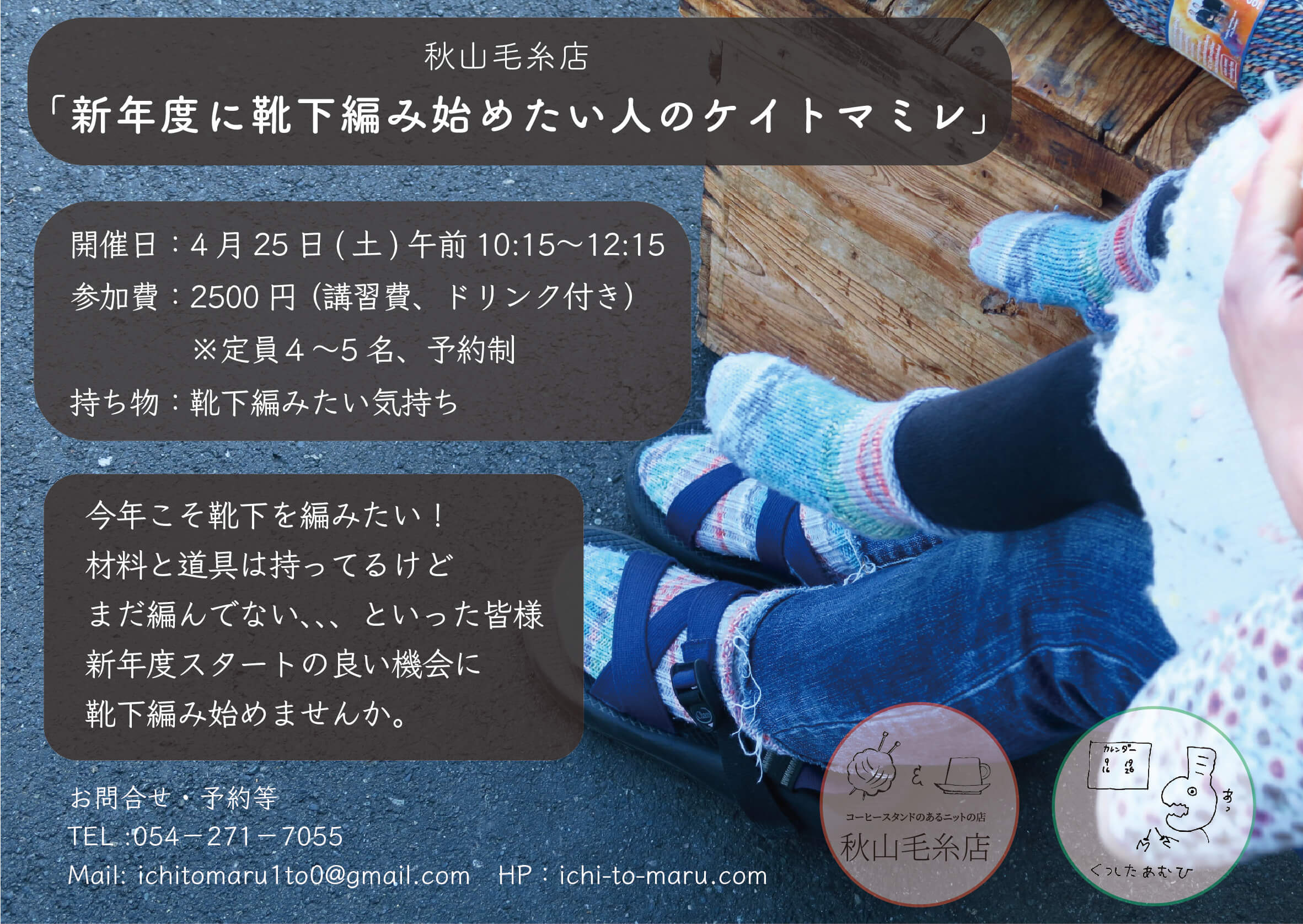 靴下編みのノウハウもお伝えしたいと思いますので、皆様のご参加お待ちしております。